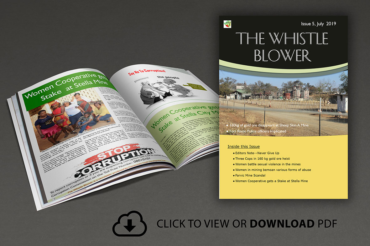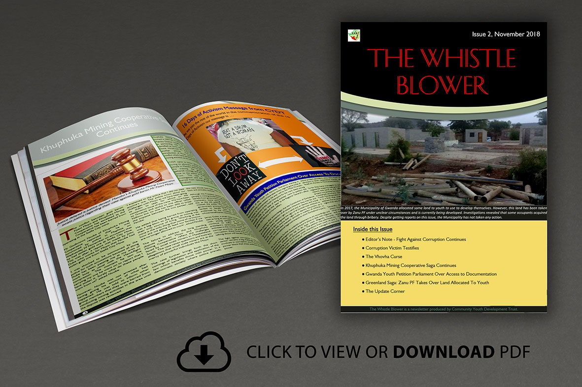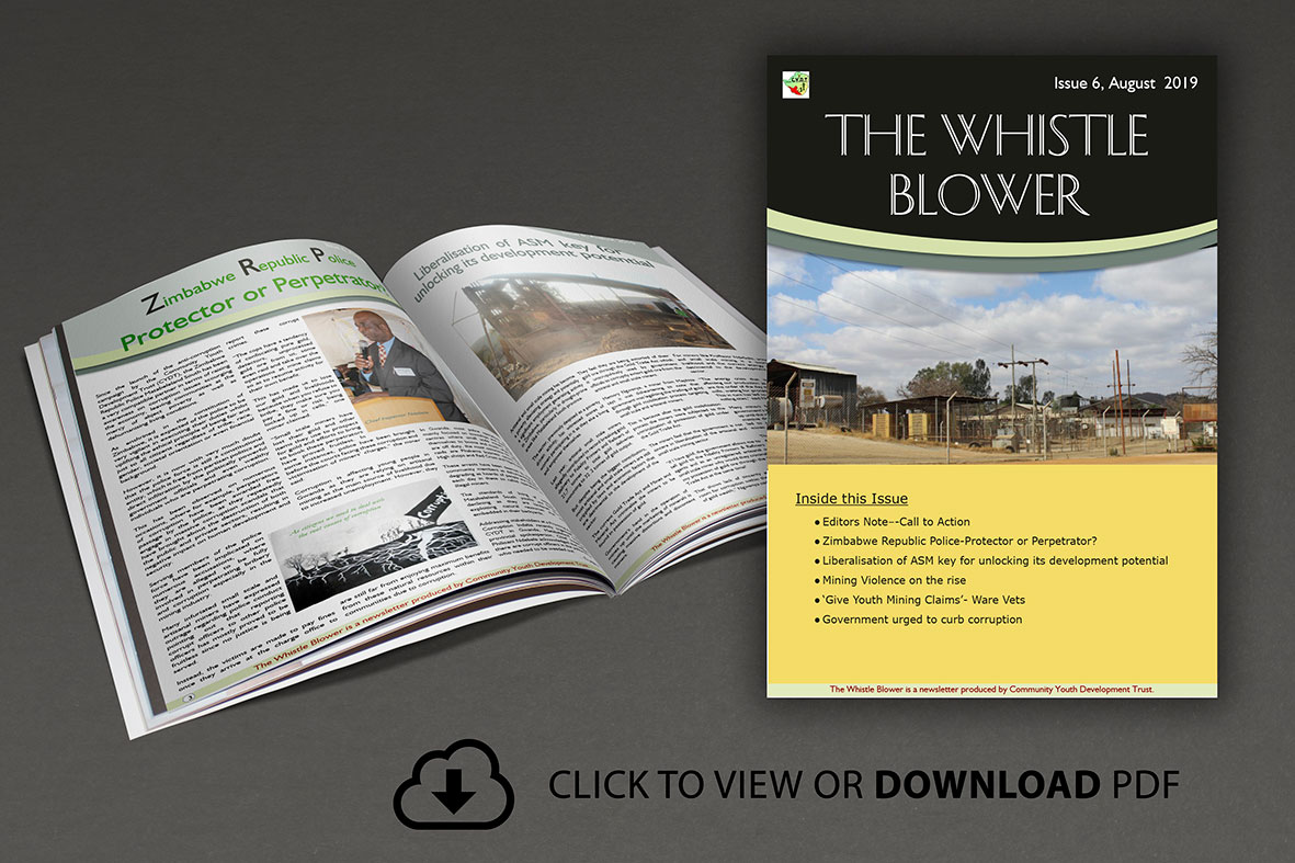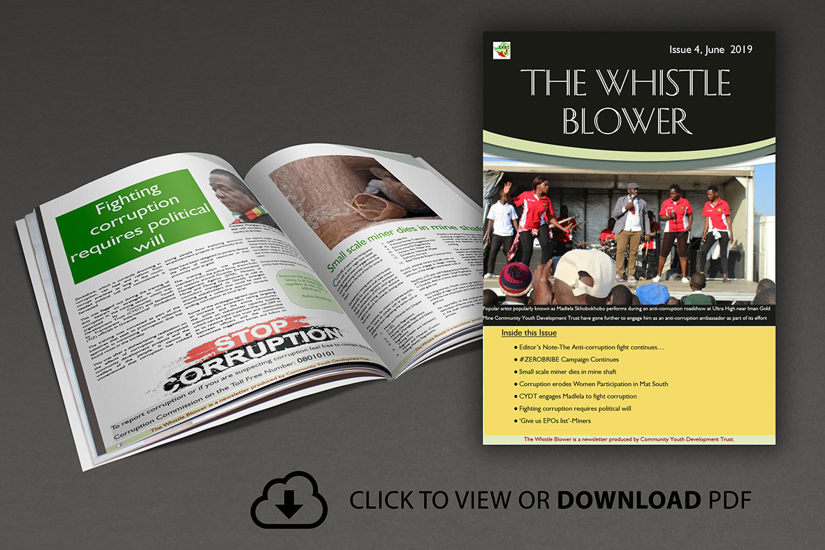 To show CYDT`s commitment in fighting corruption in Matabeleland South, it is with pleasure to bring you The Whistle Blower , CYDT`s quarterly newsletter that unpacks the state of mining in the province with a special focus on corruption. The magazine consists of articles that detail the challenges faced by artisanal and small scale miners as well as the strategies that can be adopted to improve the working environment of miners….