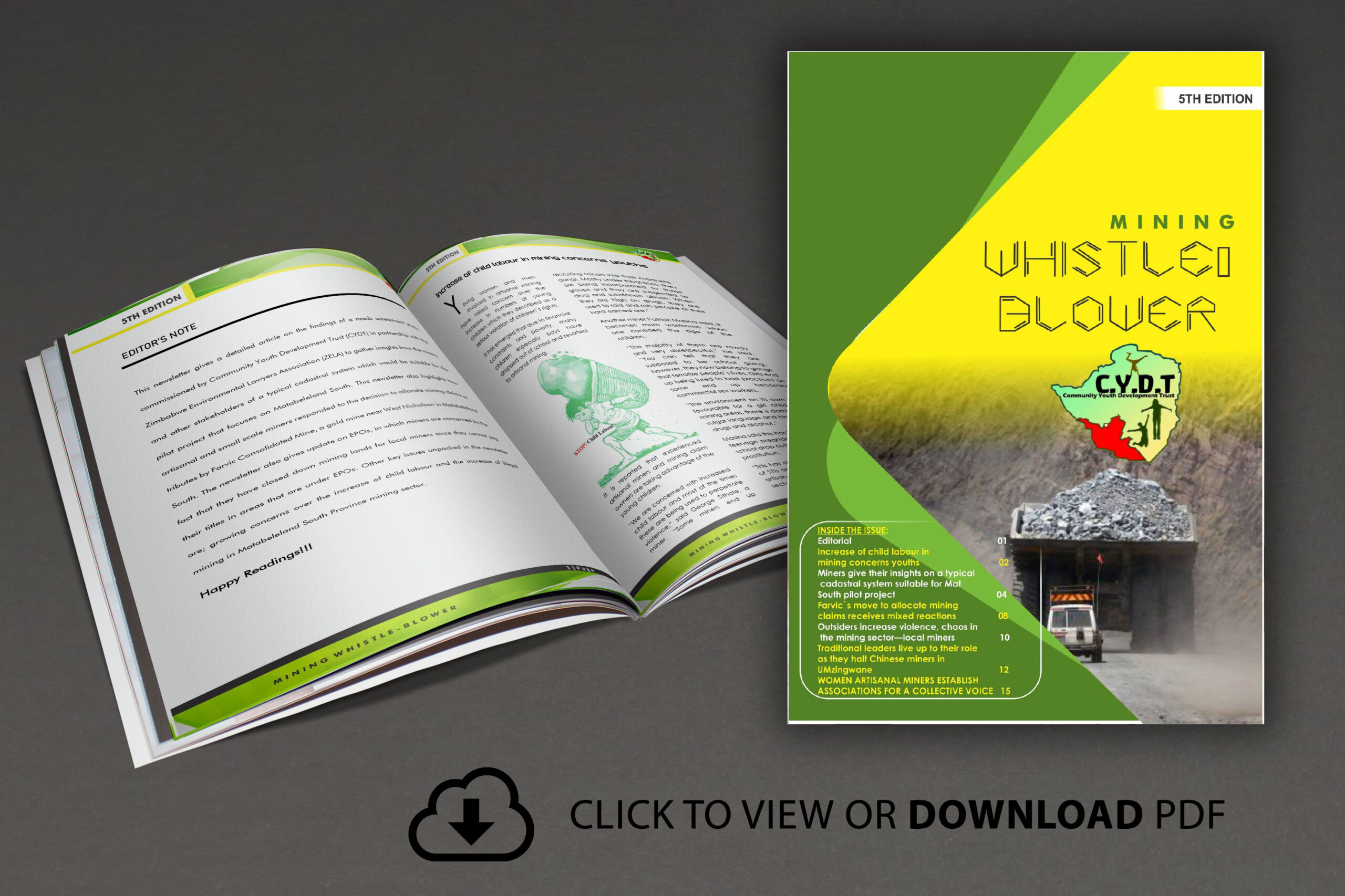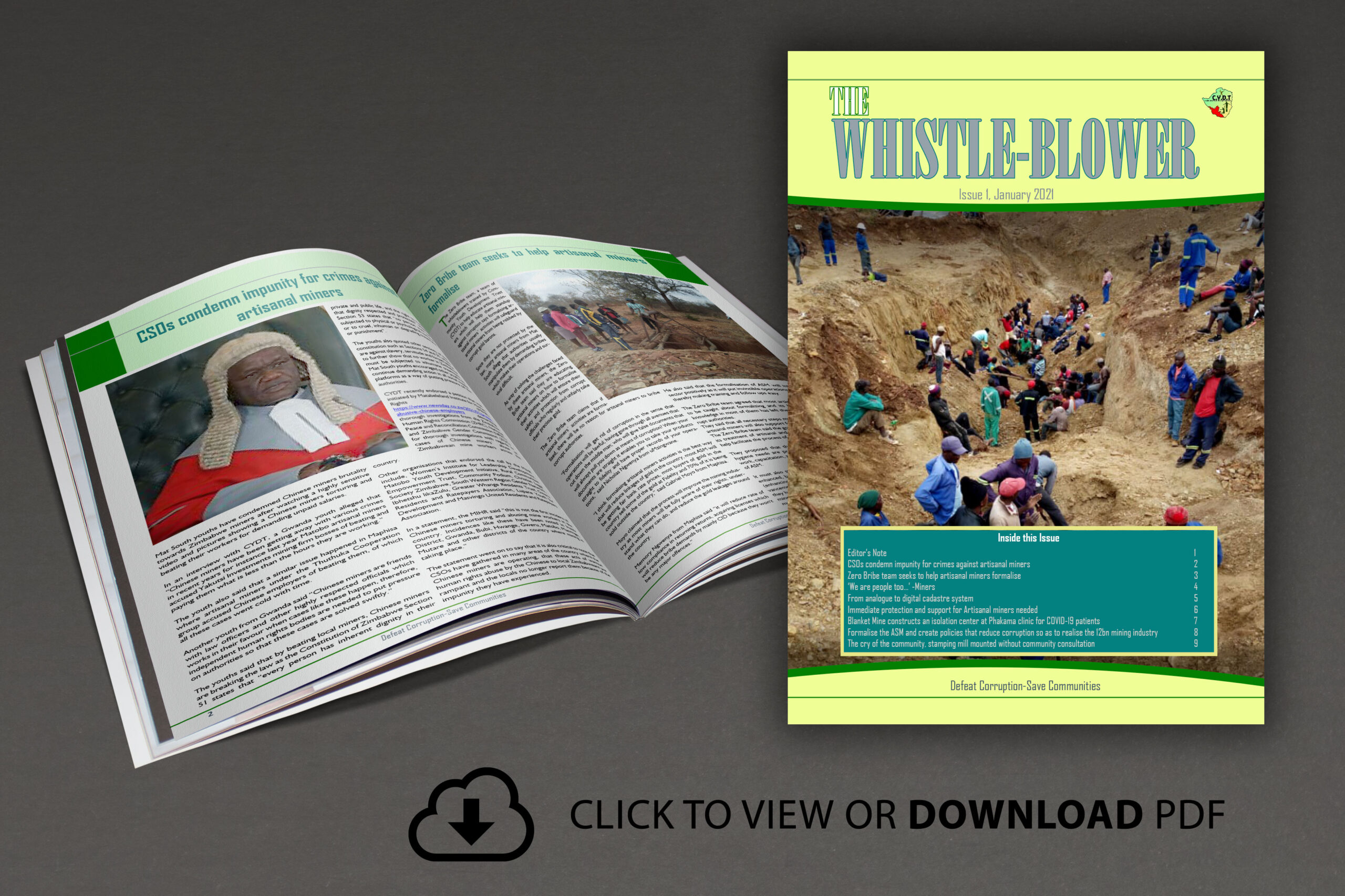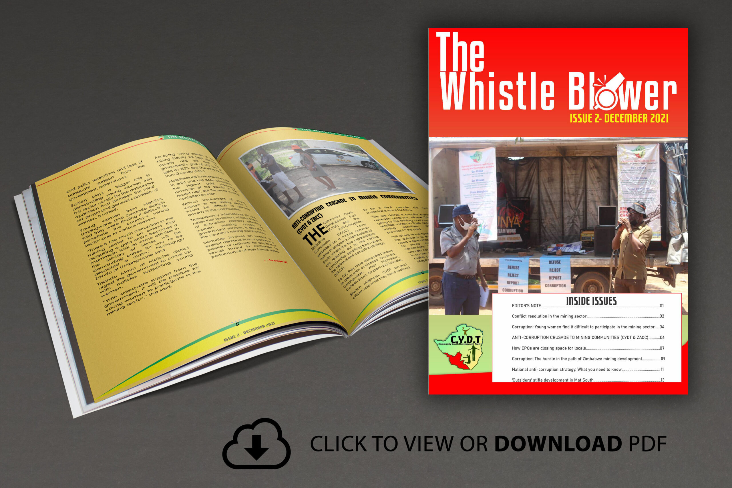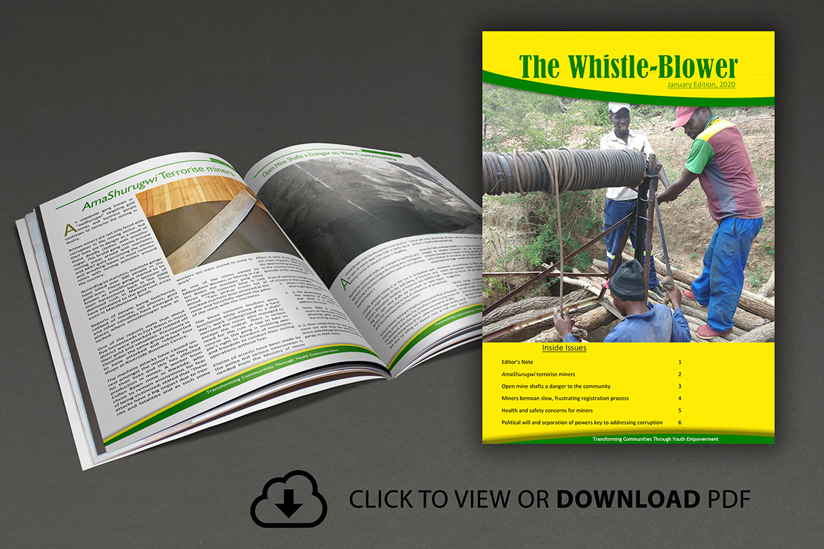 To show CYDT`s commitment in fighting corruption in Matabeleland South, it is with pleasure to bring you The Whistle Blower , CYDT`s quarterly newsletter that unpacks the state of mining in the province with a special focus on corruption. The magazine consists of articles that detail the challenges faced by artisanal and small scale miners as well as the strategies that can be adopted to improve the working environment of miners….